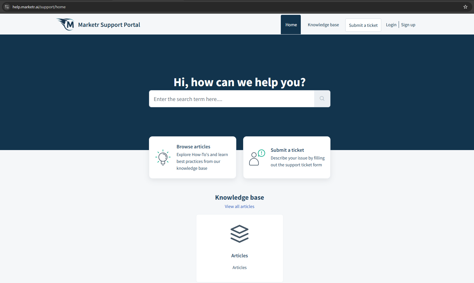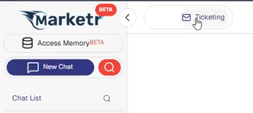 1. Ticketing Support In the event of an issue or query, users can access the ticketing option to communicate directly with the Marketr support team. It is highly recommended to use this feature for support requests when logged into the account. Ticketing button goes to https://help.marketr.ai/support/home , and you can submit a ticket, or check the knowledge base for more guidance documents.