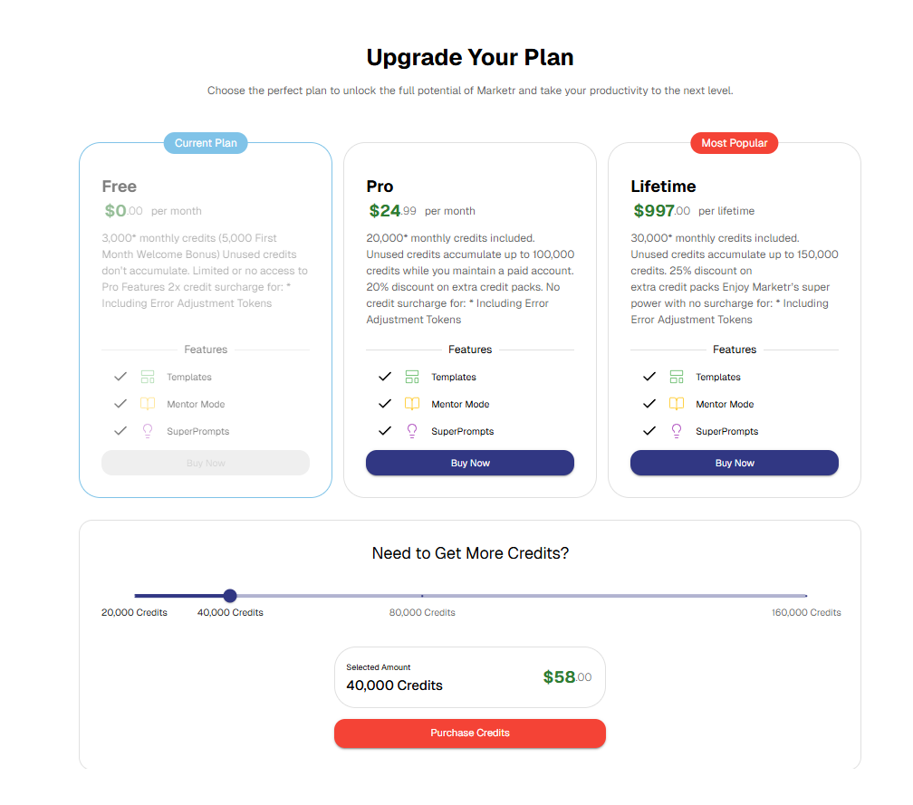 Upgrade Plan: Option to upgrade the current Marketr subscription.