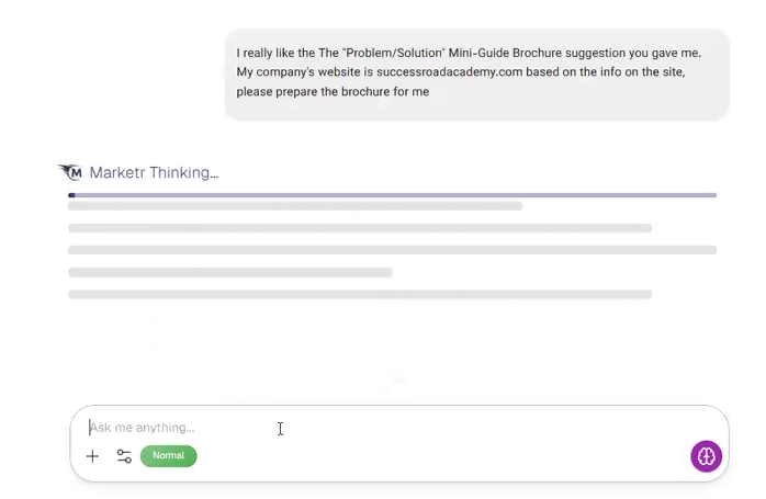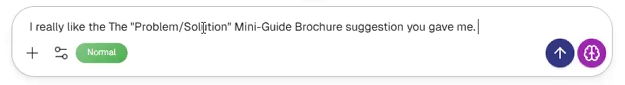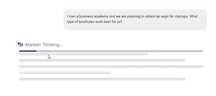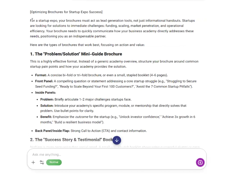 Step 2: Review Marketer's generated response, which will offer strategic recommendations.- Example Response: "For a startup expo, your brochures must act as a lead generation tool, not just informational handouts. Here are the types of brochures that work best focusing on action and values: The Problem-Solution Mini-Guide Brochure, The Success Story/Testimonial Booklet, etc."