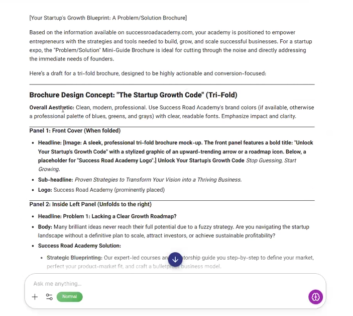- Example Prompt: "I own a Business Academy, and we are planning to attend an expo for startups. What type of brochures work best for us?"
