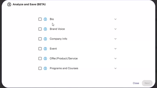 Step 2: Marketer will present options for what information to save from the current conversation (e.g., "Bio of a person," "Brand voice," "Company info," "Event," "Offer/Product/Service/Program").