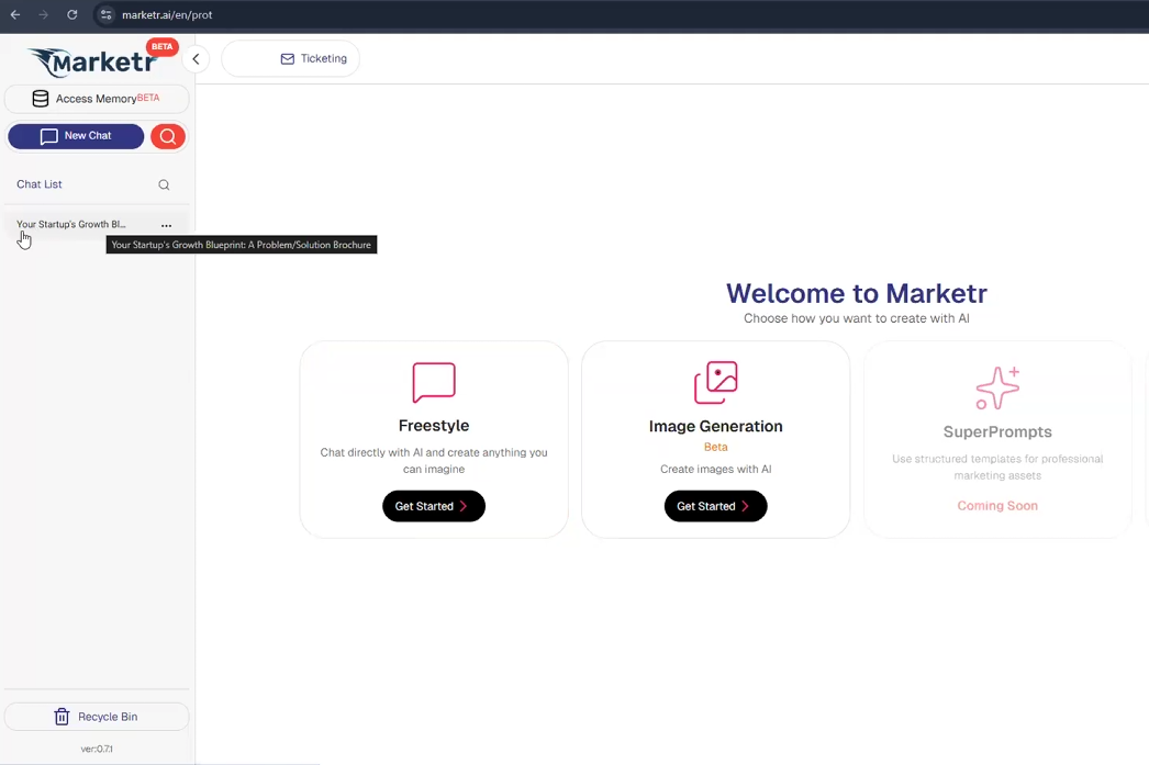 To begin a freestyle conversation, users navigate to the Marketer dashboard. The Freestyle Chat option is prominently available, serving as the entry point for open-ended interactions with the AI.