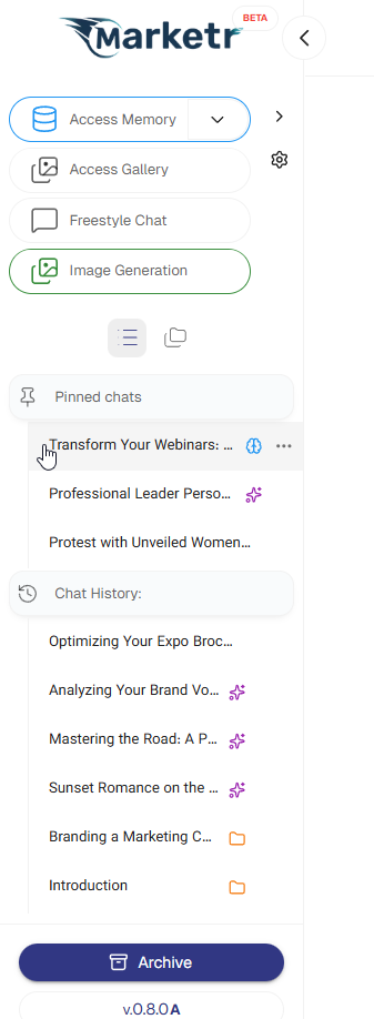 - Automatic Name Updates: As a user continues a conversation and the topic shifts, Marketer may automatically adjust the chat's title in the Chat List to reflect the most recent content. For example, a chat initially titled "Bio-optimization Blueprint" might update to "5 Promotional Emails" if the latest interaction focused on email creation for that event.