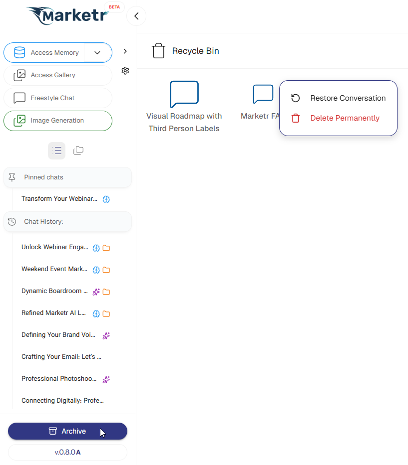 - Access Archive: The location of the Archive should be clearly visible on the dashboard or within the Chat List interface (e.g., a "Recycle Bin" icon or tab).